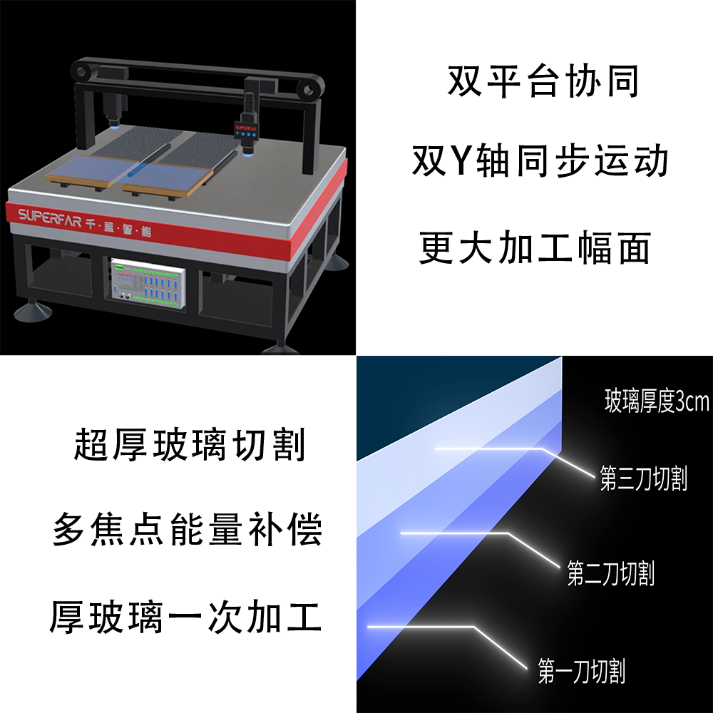 超厚玻璃处理 | 自适应多焦点能量补偿技术,可以加工厚度超30mm玻璃 |